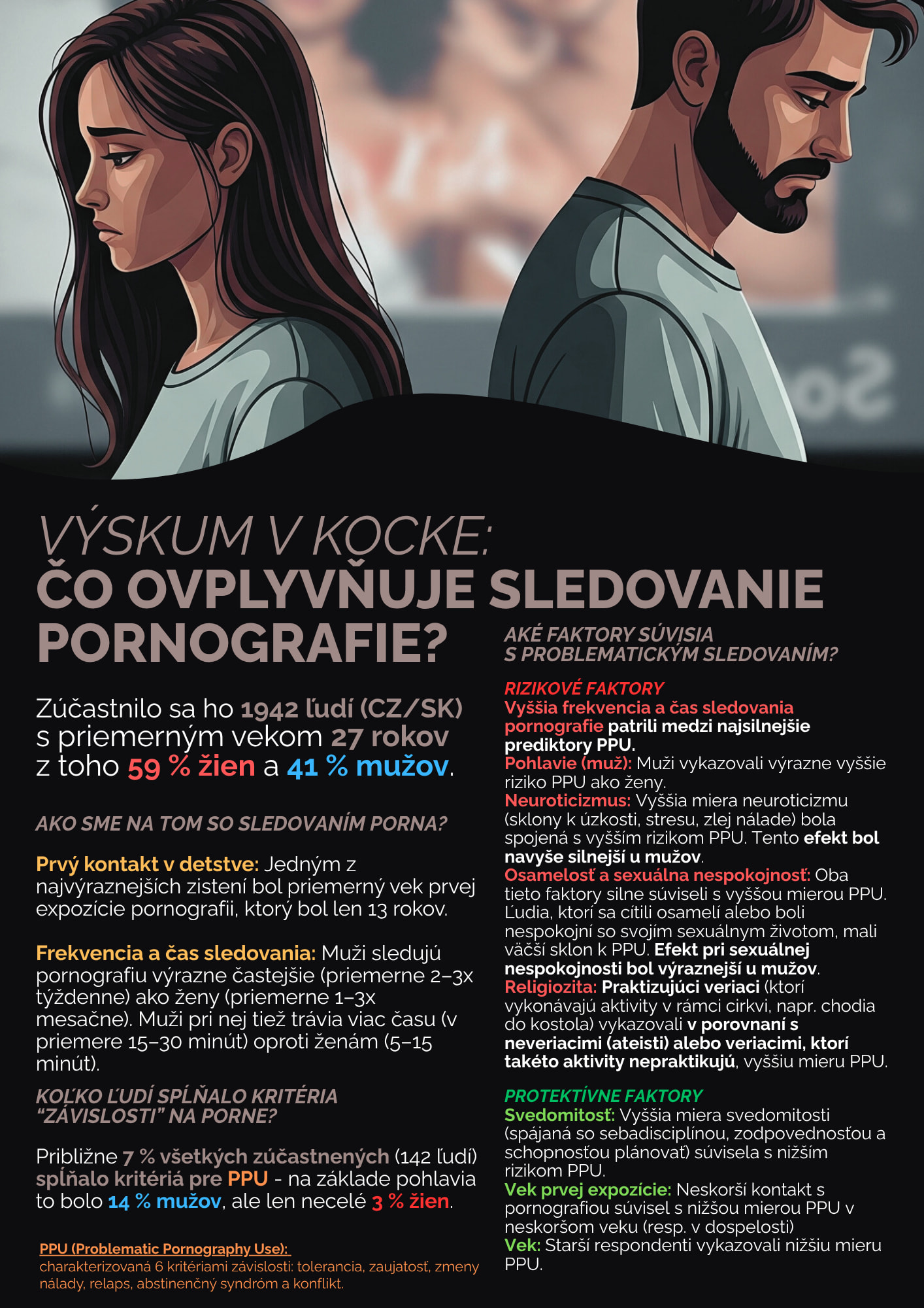 Ahoj, tak ako písal Marcipán, nezbieral som iba “závislých” na pornografii, keďže je zároveň ťažké cez online dotazník podľa nejakého výsledného čísla určiť kto je a kto nie je závislý (skôr to slúži ako indikátor závislosti). Každopádne budem vzorku deliť na tieto dve kategórie a zisťovať, do akej miery dokážu napr. tá osamelosť, sex. nespokojnosť a osobnostné charakteristiky predikovať indikovanú závislosť. Ak by si mal ešte nejaké otázky, neváhaj sa spýtať Inak veľmi ďakujem za vyplnenie